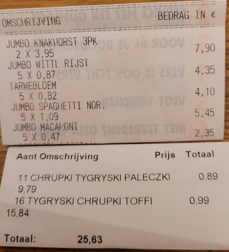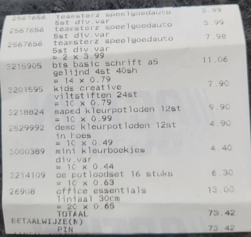 Op de kassabon kunnen jullie zien wat de inhoud van de kofferbak is en wat de totale waarde is hiervan. Dit was voor €102,70