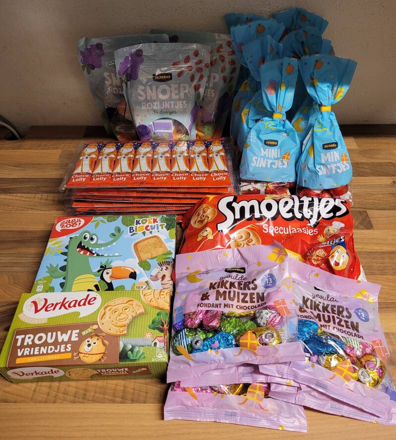 Zo hebben de kinderen in de 1e week allemaal een sinaasappel of banaan gehad. Daarnaast voor de oudere kinderen kruidnoten en voor de kleintjes een zakje rijstewafeltjes.