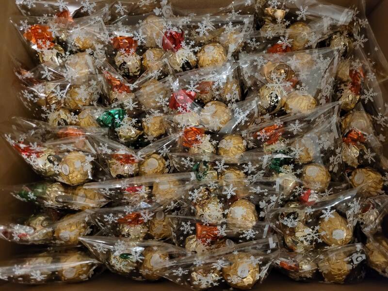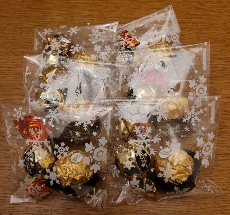 Voor 80 bewoners van woonzorglocatie de Tuinen in Bleiswijk een zakje gemaakt met daarin 3 chocolaatjes en voor het personeel nog 2 losse doosjes chocolaatjes twv €31,95