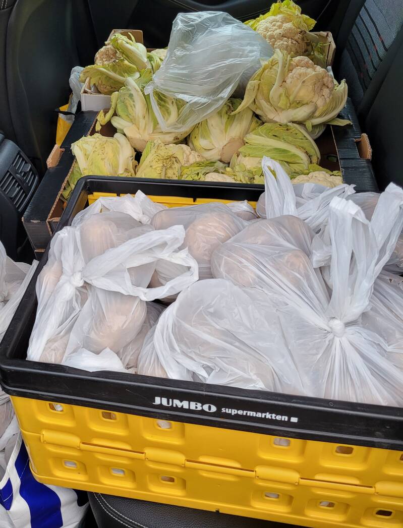 Vitamientjes gehaald voor de cliënten van de voedselbank zo op de laatste dag van het jaar. Ze konden kiezen uit kg spruiten, bloemkool of kg krootjes en nog paar mandarijnen erbij. Dit alles twv €98,85.